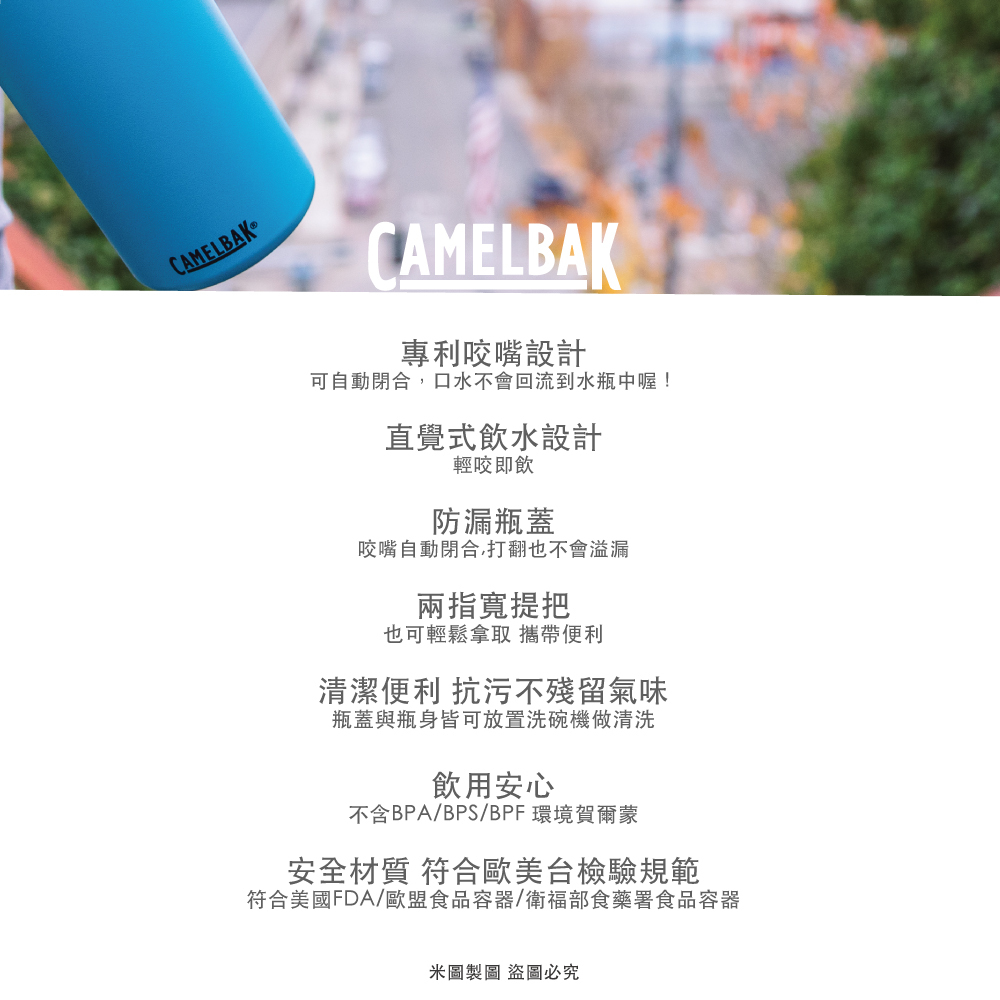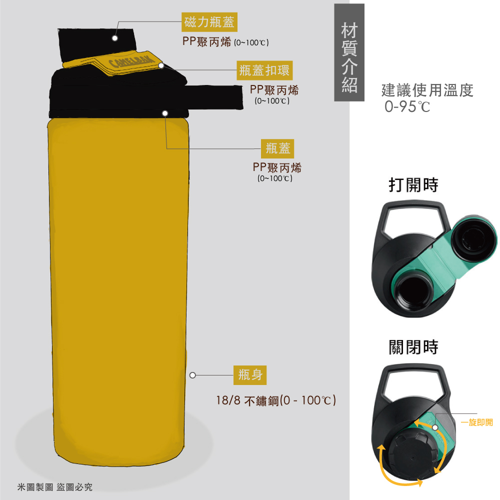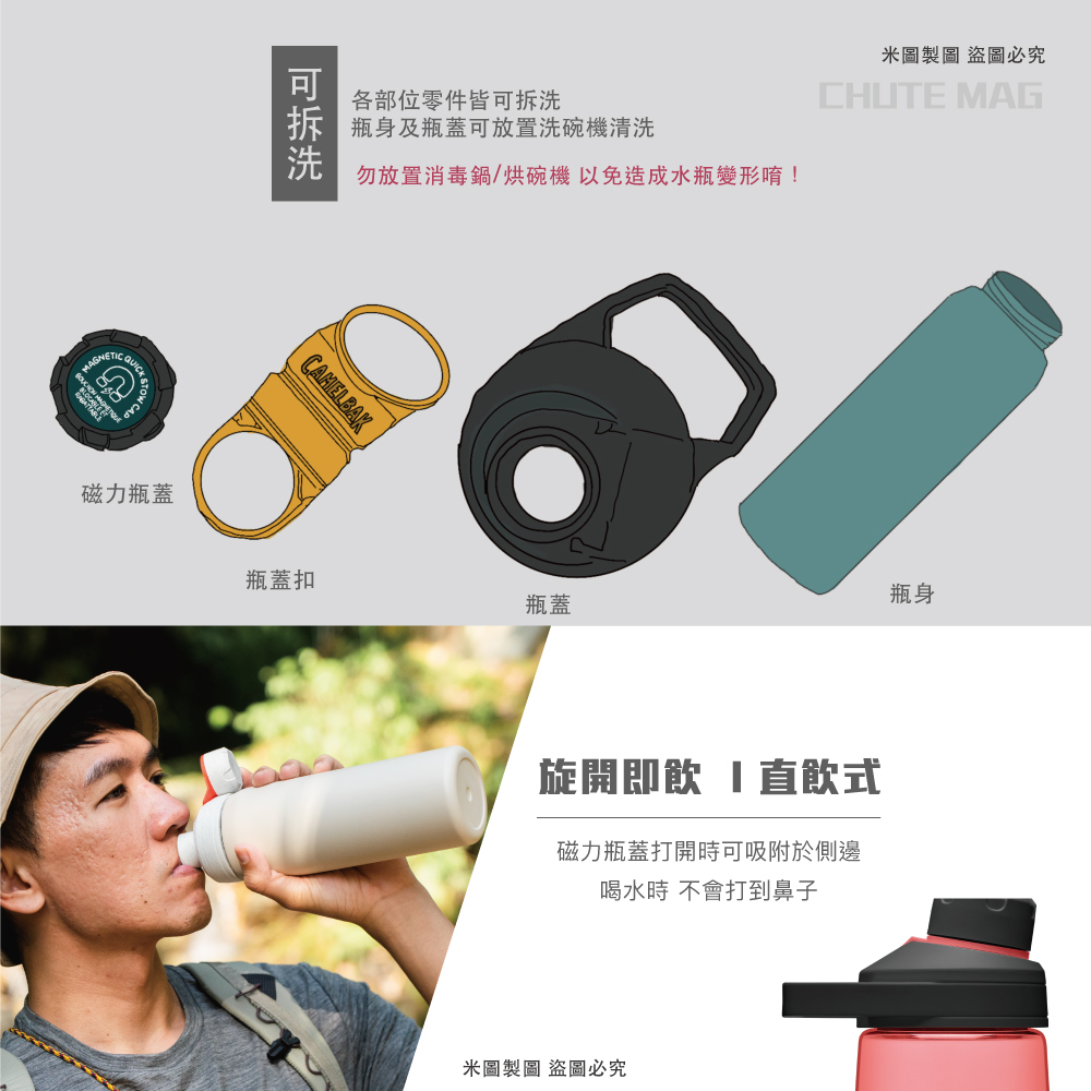 無論何時何地,CamelBak CHUTE® MAG戶外運動水瓶系列提供您快速便利的飲水。不同於市場上單純的水瓶,CHUTE® MAG戶外運動水瓶改良飲水口的設計,內螺紋方便不卡垢,全新設計的磁力瓶嘴蓋可吸附於側邊,讓您暢快飲用,一體成型的兩指寬熱塑提把設計,方便您隨時攜帶。