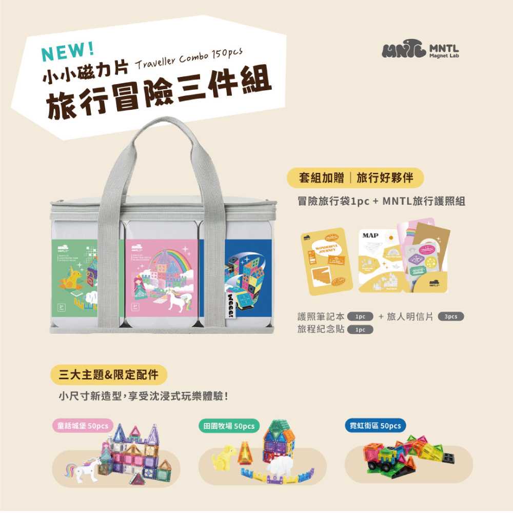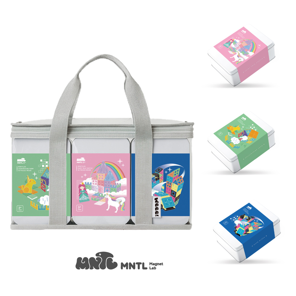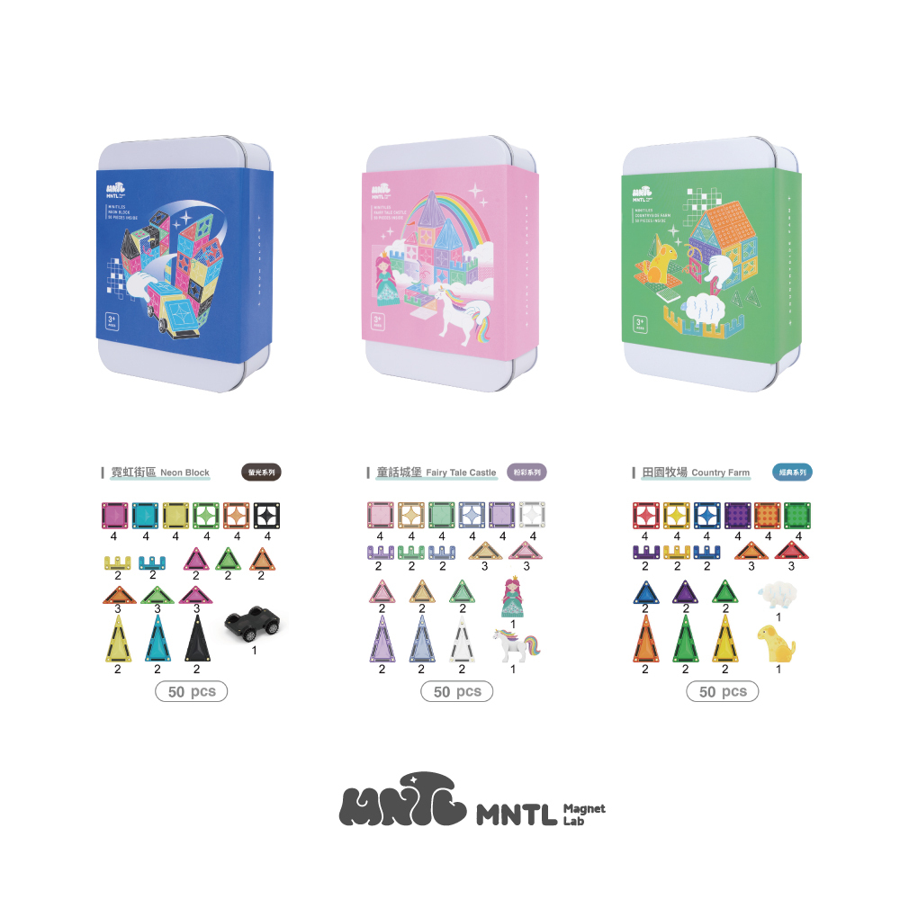 MNTL 旅行冒險三件組 隨身帶著走 磁力片鐵盒組 童話城堡50pcs 田園牧場50pcs 霓虹街區50pcs