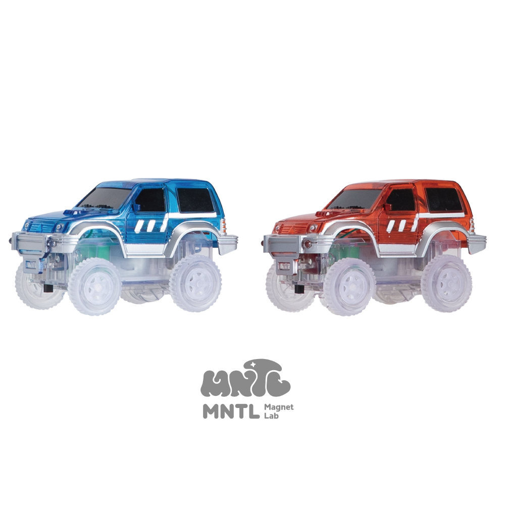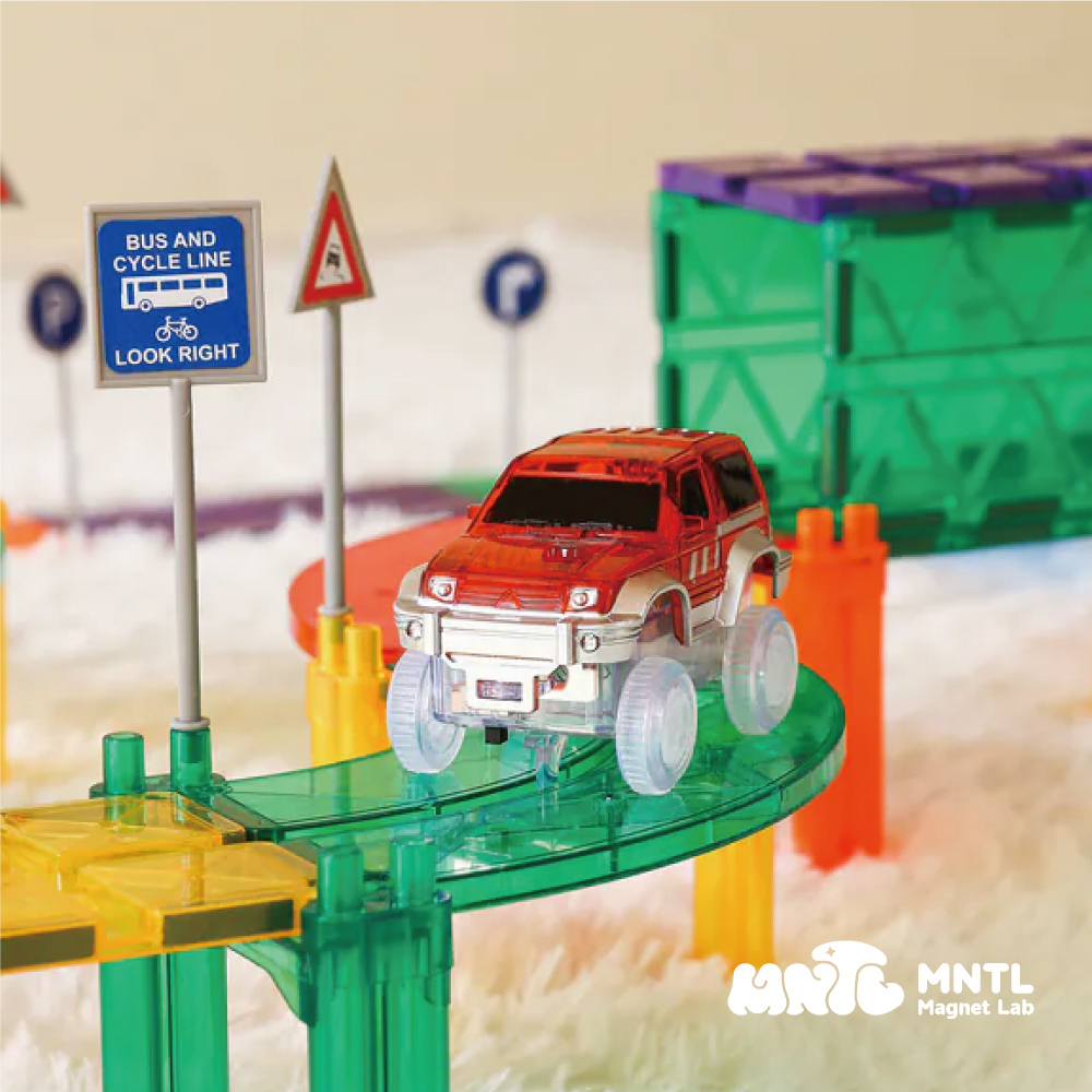 動感刺激的磁力片軌道車!有特別的卡榫設計,讓車子可以在磁力軌道片上自動行駛。具備開關電源、換電池的功能。
